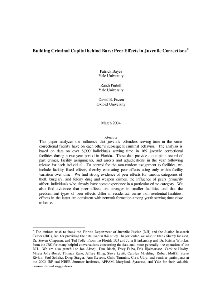 Building Criminal Capital behind Bars: Peer Effects in Juvenile Corrections Patrick Bayer Yale University Randi Pin toff Yale University David E. A Dozen Oxford University March 2004AbstractThis paper