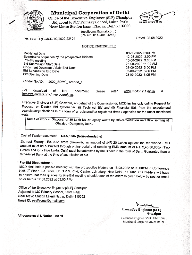 Request for Proposal Selection of Bidder for Disposal of 30 Lakh MT of legacy waste by Bioremediation and Biomining at Jaipur Dumpsite, DelhiIssued by MUNICIPAL CORPORATION OF DELHI Email: eeslfedmc@gmail.com