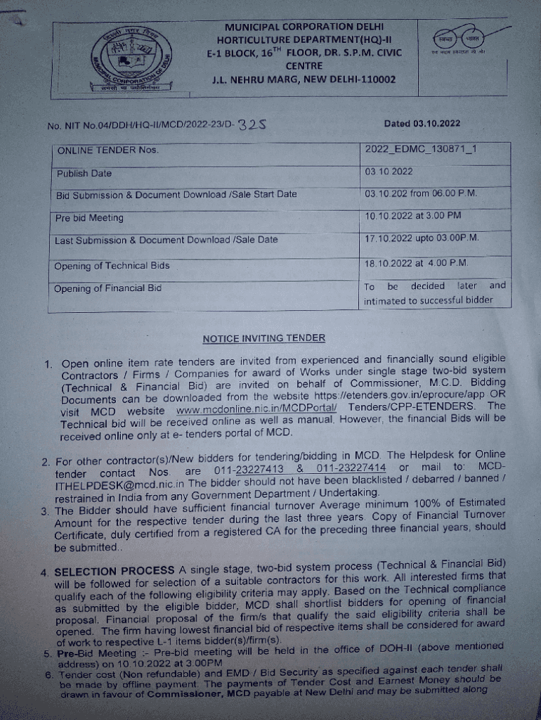 Get the free NOTICE INVITING TENDER - Municipal Corporation of Delhi