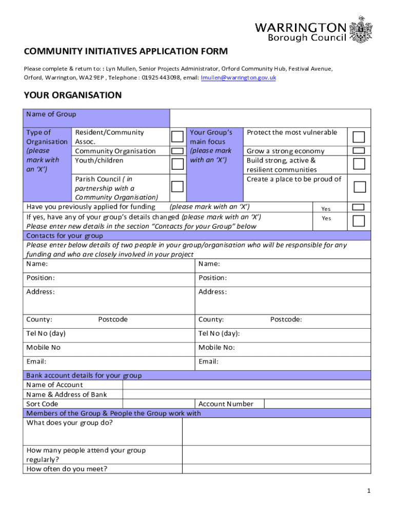 COMMUNITY INITIATIVES APPLICATION FORM Please complete & return to: : Lynn Mullen, Senior Projects Administrator, Oxford Community Hub, Festival Avenue, Oxford, Warrington, WA2 9EP, Telephone : 01925