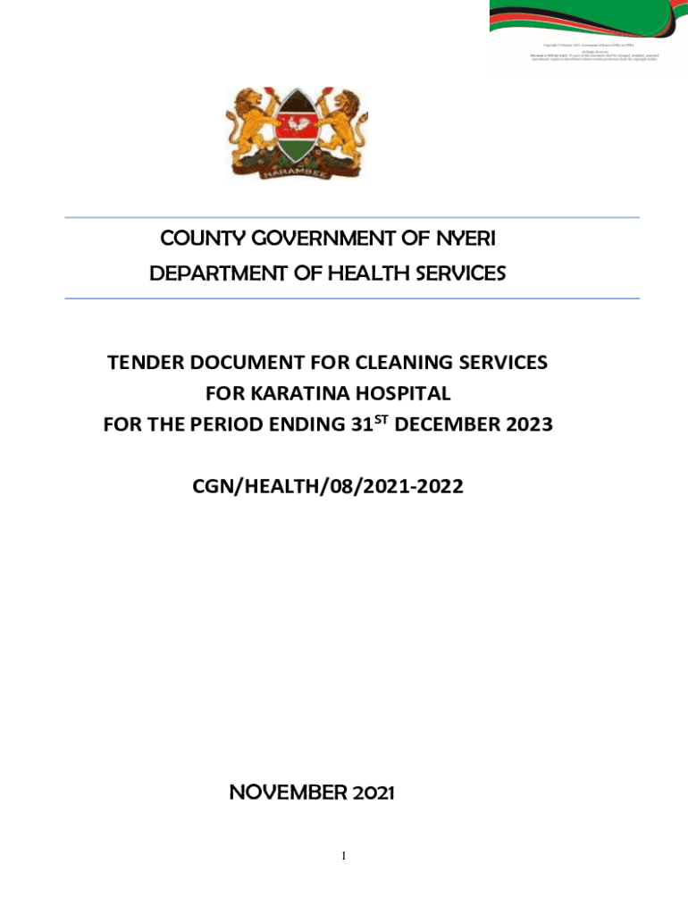 COUNTY GOVERNMENT OF MYERS DEPARTMENT OF HEALTH SERVICESTENDER DOCUMENT FOR CLEANING SERVICES FOR KARAT INA HOSPITAL FOR THE PERIOD ENDING 31ST DECEMBER 2023 CGN/HEALTH/08/20212022NOVEMBER 2021 1COUNTY