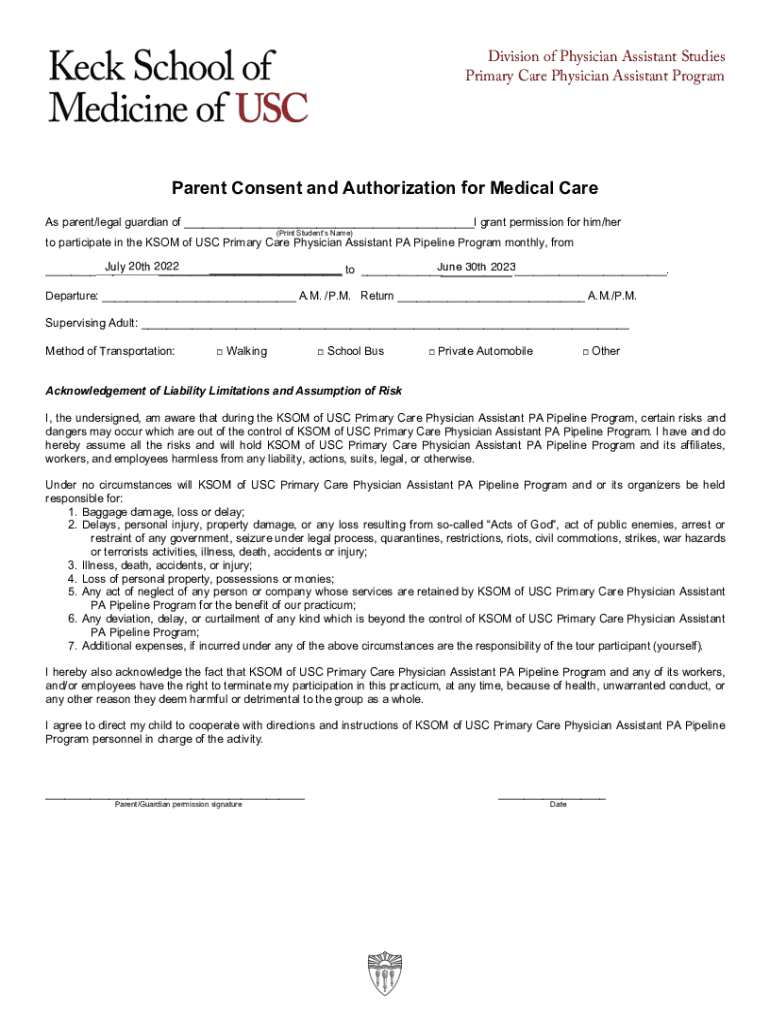 Primary Care Physician Assistant ProgramParent Consent and Authorization for Medical Care
