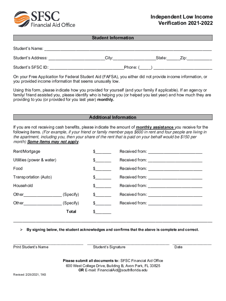 Independent Low Income Verification 20212022 Student Information Students Name: ___ Students Address: ___City:___State:___Zip:___ Students SFC ID: ___Phone: (___) ___ On your Free Application for