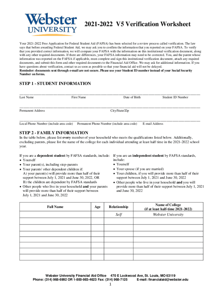 20212022 V5 Verification Worksheet Your 20212022 Free Application for Federal Student Aid (FAFSA) has been selected for a review process called verification. The law says that before awarding Federal