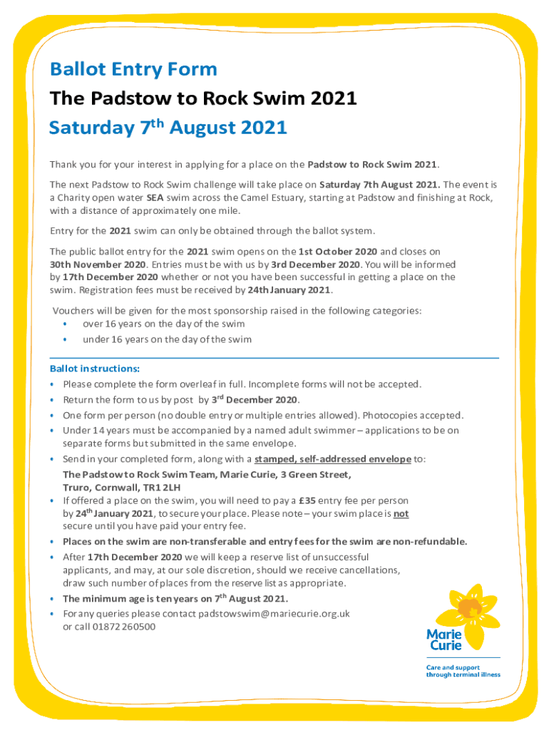 Get the free Ballot Entry Form - The Padstow to Rock Swim 2021