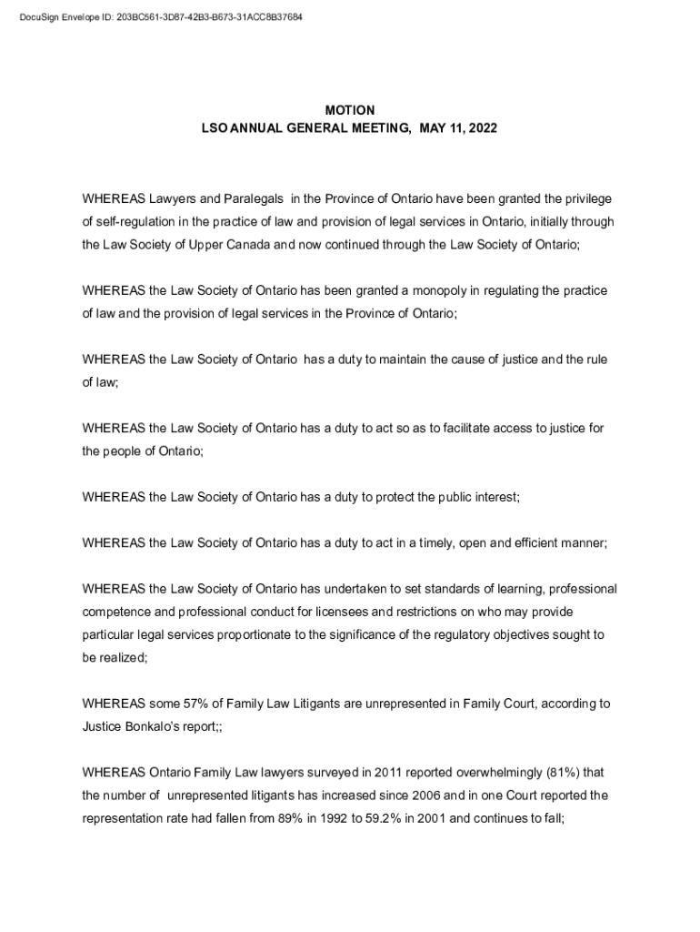 DocuSign Envelope ID: 203BC5613D8742B3B67331ACC8B37684 9FF5A5F71863488CB9B1DFA7908E9DA6MOTION LSO ANNUAL GENERAL MEETING, MAY 11, 2022WHEREAS Lawyers and Paralegals in the Province of Ontario have