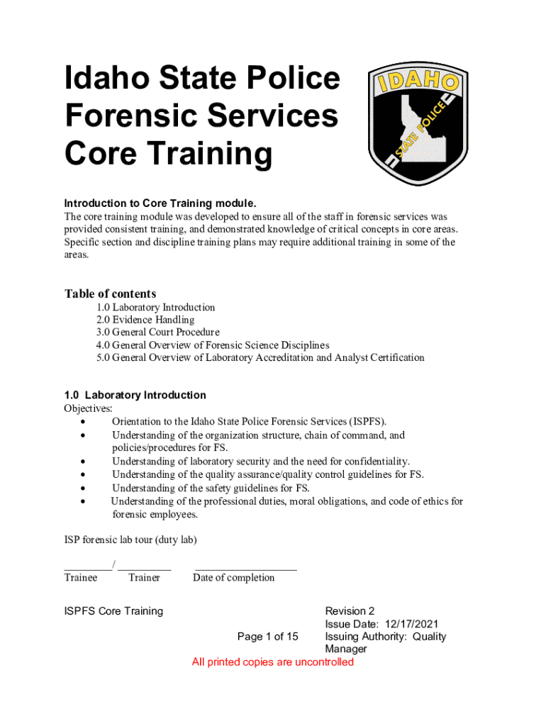 Idaho State Police Forensic Services Core Training Introduction to Core Training module. The core training module was developed to ensure all the staff in forensic services was provided consistent