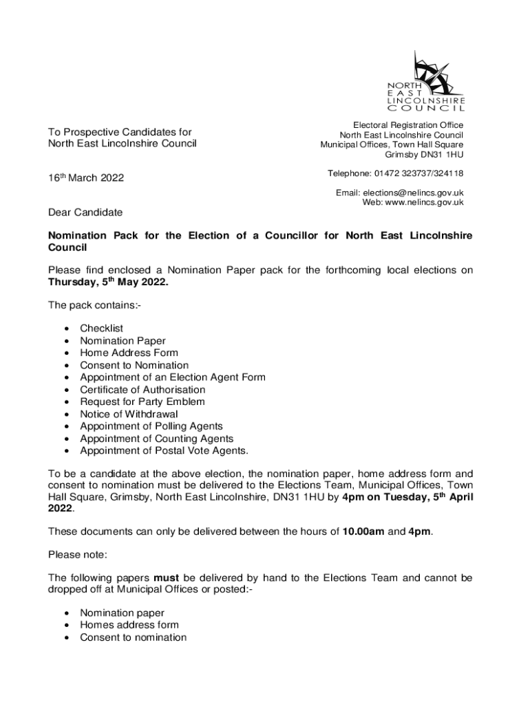 NORTHEAST LI NCO L SHI I RE Council Prospective Candidates for North East Lincolnshire Council 16th March 2022Electoral Registration Office North East Lincolnshire Council Municipal Offices, Town