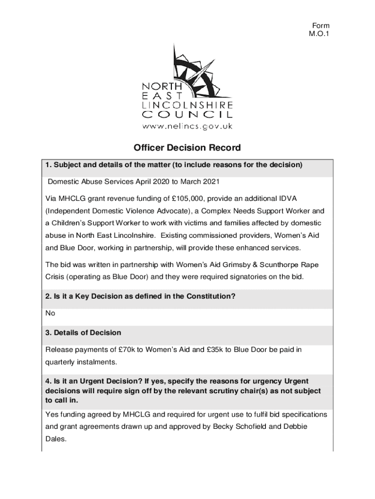Form M.O.1Officer Decision Record 1. Subject and details of the matter (to include reasons for the decision) Domestic Abuse Services April 2020 to March 2021 Via MH CLG grant revenue funding of 105,000,