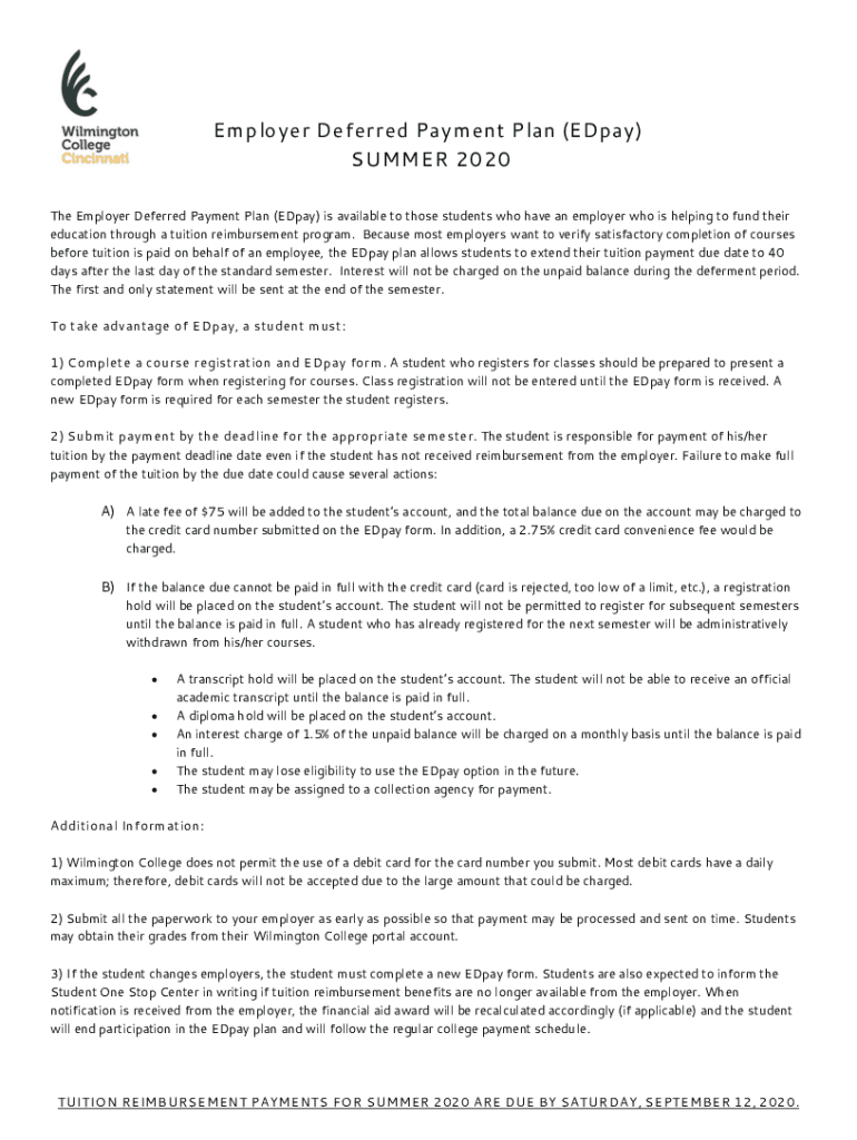 Employer Deferred Payment Plan (EDpay) SUMMER 2020 The Employer Deferred Payment Plan (EDpay) is available to those students who have an employer who is helping to fund their education through a tuition