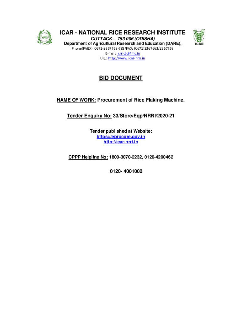 CAR NATIONAL RICE RESEARCH INSTITUTE CUTTACK 753 006 (ODISHA) Department of Agricultural Research and Education (DARE), Phone(PBX): 06712367768783/FAX: (0671)2367663/2367759 Email: crrictc@nic.in