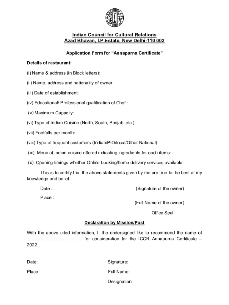Indian Council for Cultural Relations Azad Haven, I.P. Estate, New Delhi110 002 Application Form for Annapurna Certificate Details of restaurant: (i) Name & address (in Block letters): (ii) Name,
