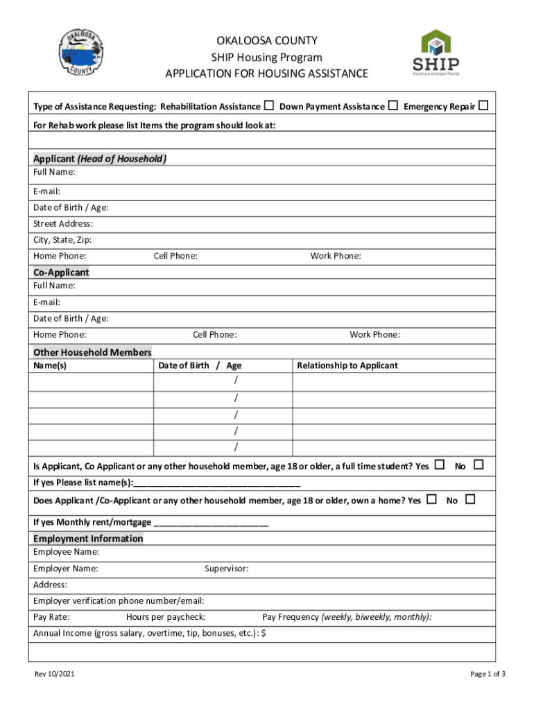 OKALOOSA COUNTY SHIP Housing Program APPLICATION FOR HOUSING ASSISTANCE Type of Assistance Requesting: Rehabilitation Assistance Down Payment Assistance Emergency Repair For Rehab work please list
