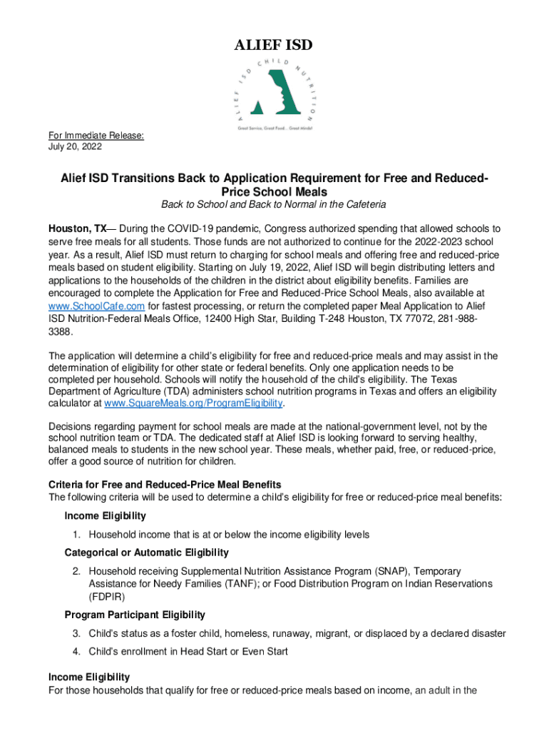 ALIEN Indoor Immediate Release: July 20, 2022Alief ISD Transitions Back to Application Requirement for Free and Reduced Price School Meals Back to School and Back to Normal in the Cafeteria Houston,