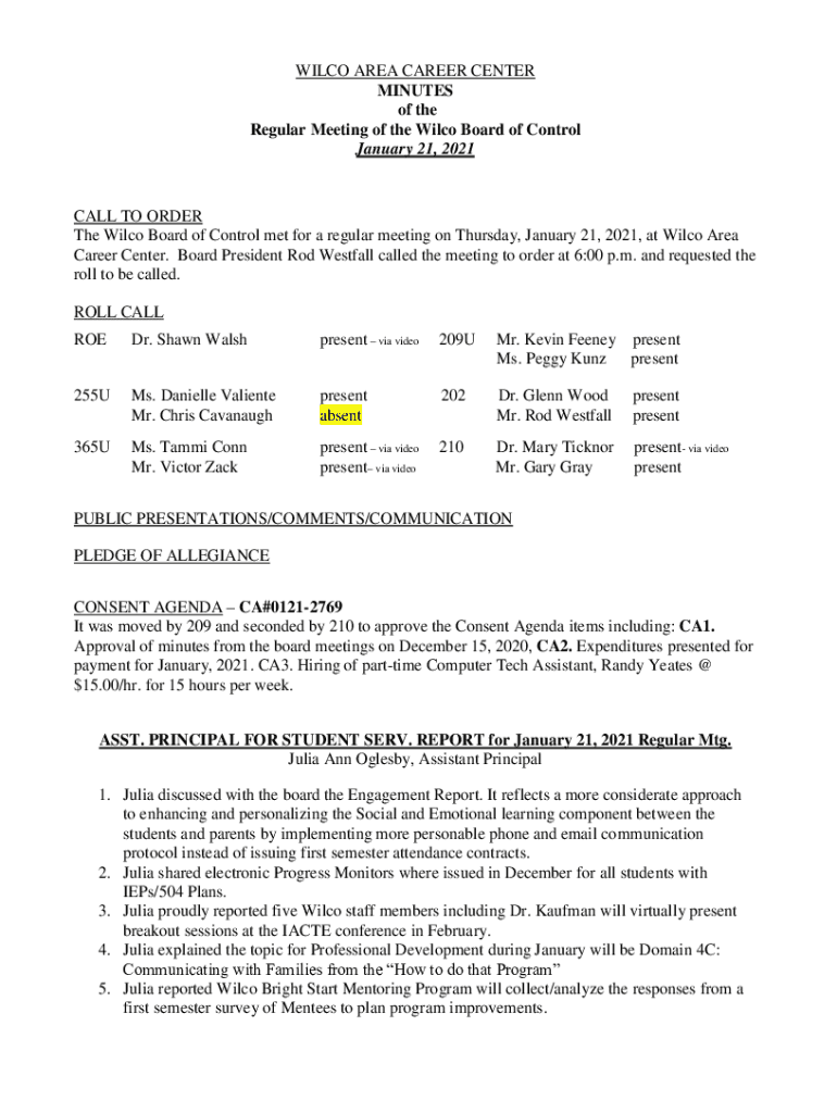WILCOX AREA CAREER CENTER MINUTES of the Regular Meeting of the Wilcox Board of Control January 21, 2021CALL TO ORDER The Wilcox Board of Control met for a regular meeting on Thursday, January 21,