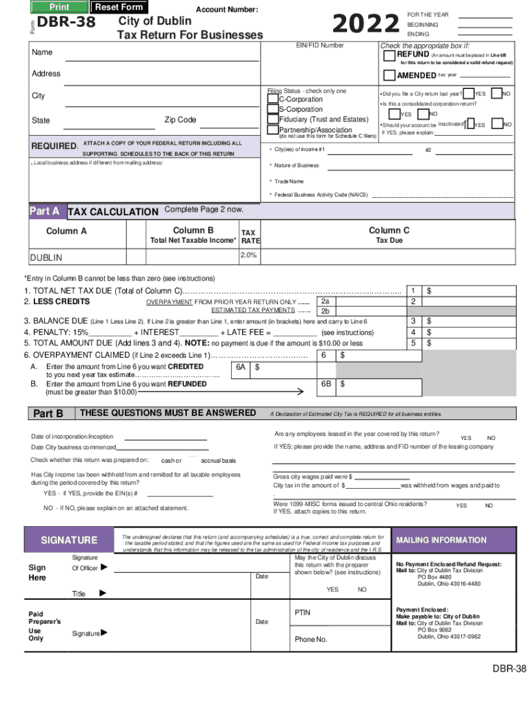 FormPrintReset FormDBR38Account Number:2022City of Dublin Tax Return For Businesses EIN/FID Number THE YEAR BEGINNING ENDINGCheck the appropriate box if:NameREFUND(An amount must be placed in Line