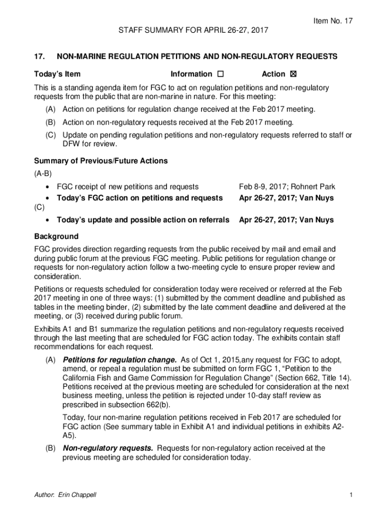 Item No. 17 STAFF SUMMARY FOR APRIL 2627, 2017 17.MARINE REGULATION PETITIONS AND REGULATORY REQUESTSTodays ItemInformation Action This is a standing agenda item for FGC to act on regulation petitions