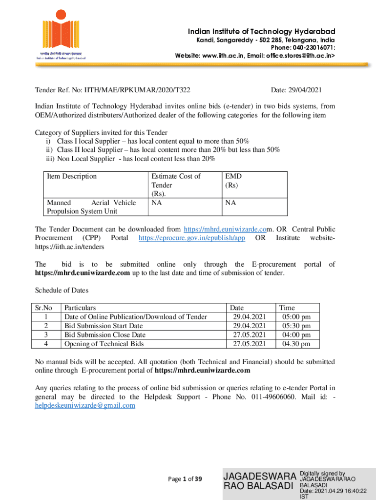 Indian Institute of Technology Hyderabad Kanji, Haggardly 502 285, Telangana, India Phone: 04023016071: Website: www.iith.ac.in, Email: office.stores@iith.ac.inTender Ref. No: WITH/MAE/KUMAR/2020/T322Date: