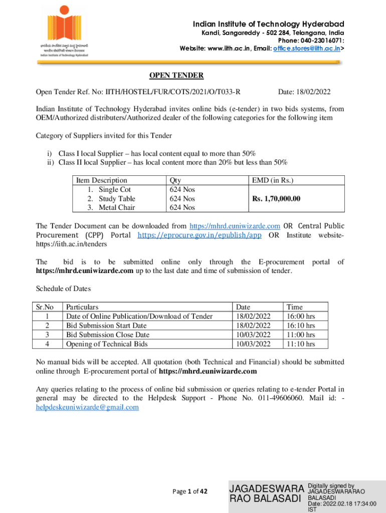 Indian Institute of Technology Hyderabad Kanji, Haggardly 502 284, Telangana, India Phone: 04023016071: Website: www.iith.ac.in, Email: office.stores@iith.ac.inOPEN TENDER Open Tender Ref. No: WITH/HOSTEL/FUR/COTS/2021/O/T033RDate: