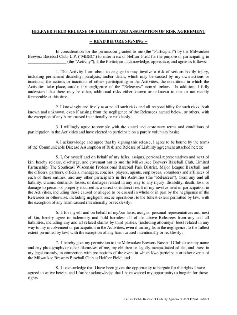 Get the free Helfaer Field Release of Liability Agreement - BallCharts.com