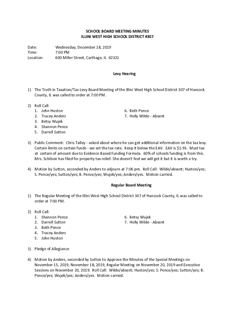 SCHOOL BOARD MEETING MINUTES KILLING WEST HIGH SCHOOL DISTRICT #307 Date: Time: Location:Wednesday, December 18, 2019 7:00 PM 600 Miller Street, Carthage, IL 62321Levy Hearing1) The Truth in Taxation/Tax
