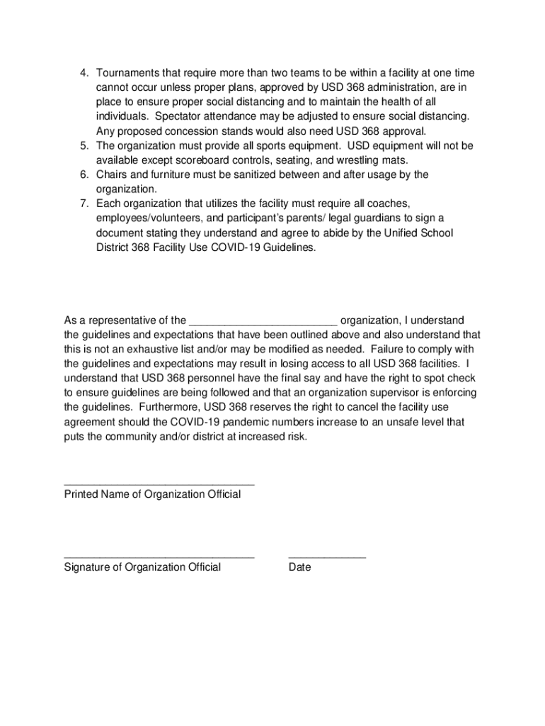Paola Unified School District 368 Facility Use COVID-19 Guidelines to the ongoing COVID-19 pandemic, USD 368 has enacted additional guidelines and protocol that must be followed in order for outside