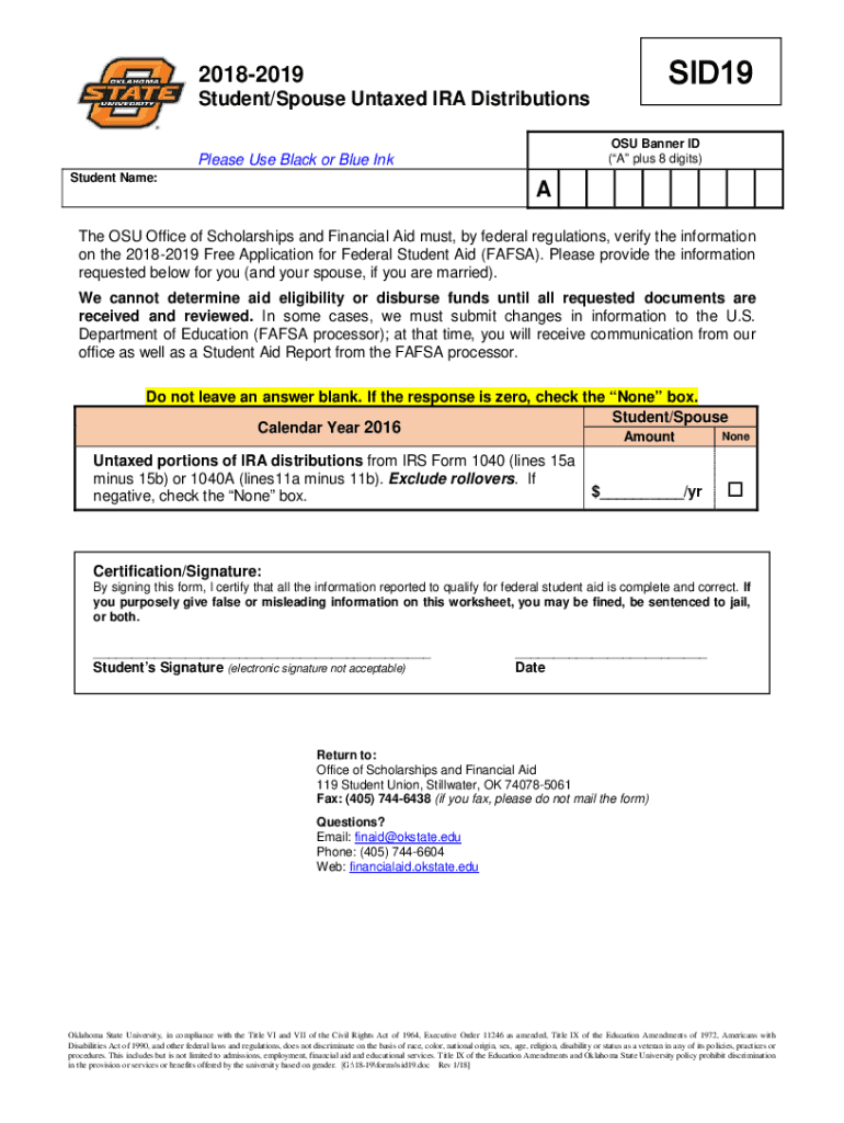 SID1920182019 Student/Spouse Untamed IRA Distributions OSU Banner ID (A plus 8 digits)Please Use Black or Blue Ink Student Name:The OSU Office of Scholarships and Financial Aid must, by federal regulations,