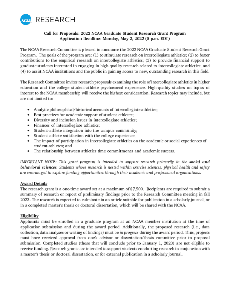 Call for Proposals: 2022 NCAA Graduate Student Research Grant Program Application Deadline: Monday, May 2, 2022:5 p.m. EDT) The NCAA Research Committee is pleased to announce the 2022 NCAA Graduate