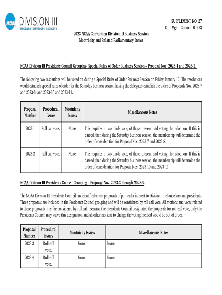 2023 NCAA Convention Division III Business Session Motility and Related Parliamentary IssuesSUPPLEMENT NO. 27 III MGMT Council 01/23NCAA Division III Presidents Council Grouping Special Rules of Order