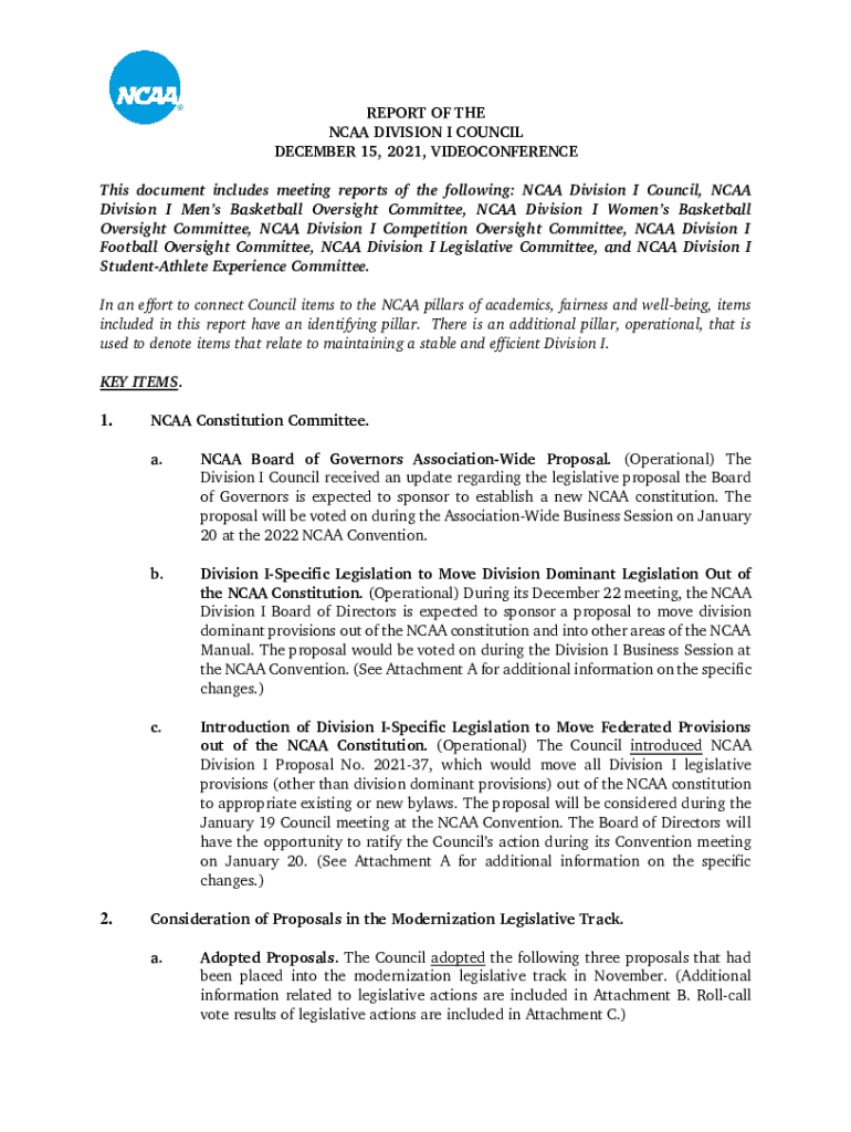REPORT OF THE NCAA DIVISION I COUNCIL DECEMBER 15, 2021, VIDEOCONFERENCE This document includes meeting reports of the following: NCAA Division I Council, NCAA Division I Men Basketball Oversight