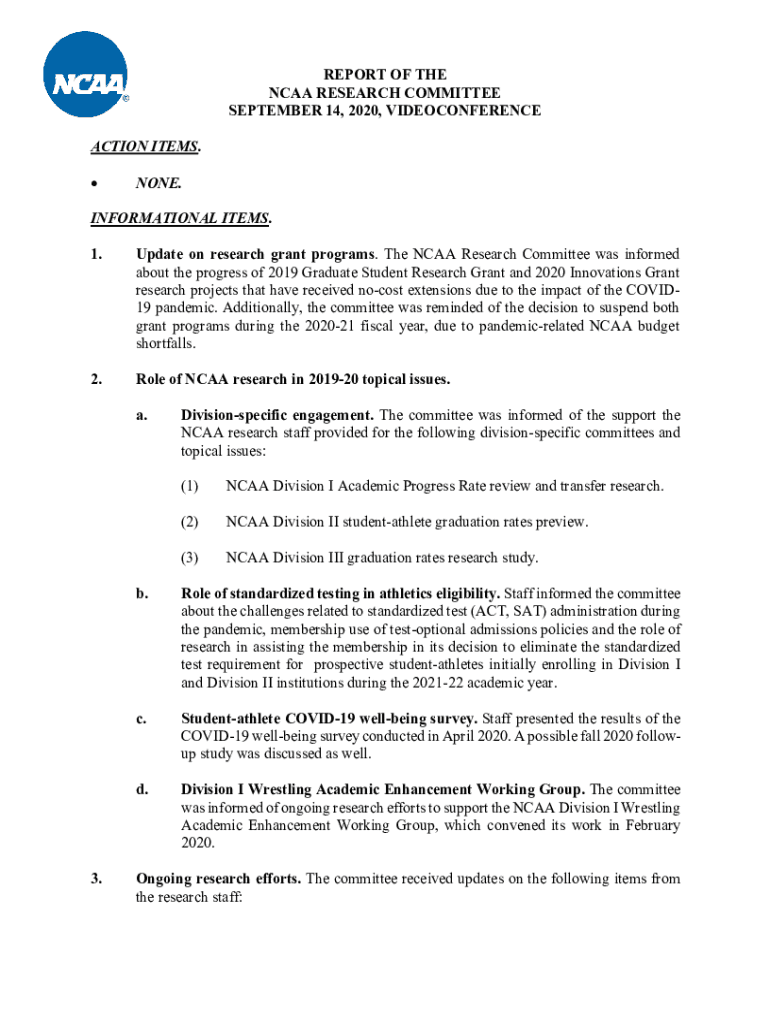 REPORT OF THE NCAA RESEARCH COMMITTEE SEPTEMBER 14, 2020, VIDEOCONFERENCE ACTION ITEMS. NONE.INFORMATIONAL ITEMS. 1. Update on research grant programs. The NCAA Research Committee was informed about