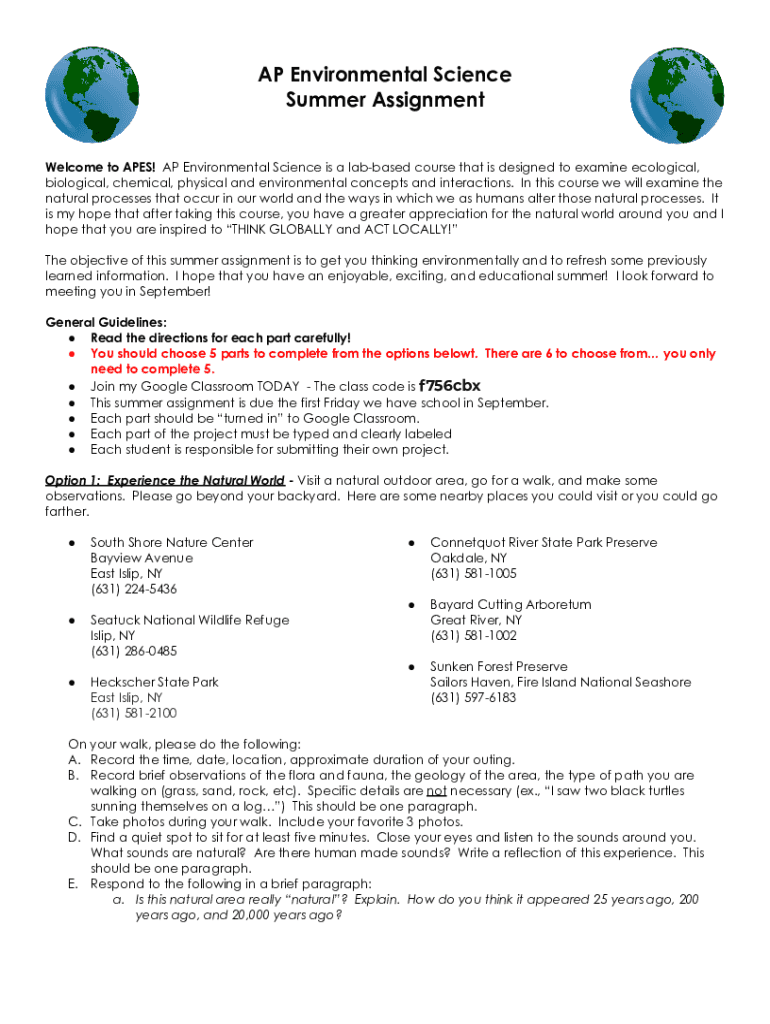 Information such as reading assignments, writing assignments, research projects, and potentially quizzes or tests must be completed and reported on AP Environmental Science summer assignment.