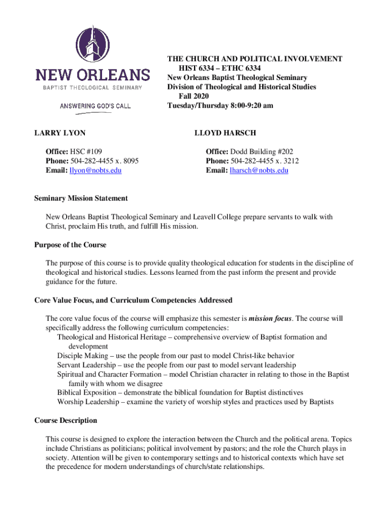THE CHURCH AND POLITICAL INVOLVEMENT HIST 6334 ETC 6334 New Orleans Baptist Theological Seminary Division of Theological and Historical Studies Fall 2020 Tuesday/Thursday 8:009:20 marry LYON Office: