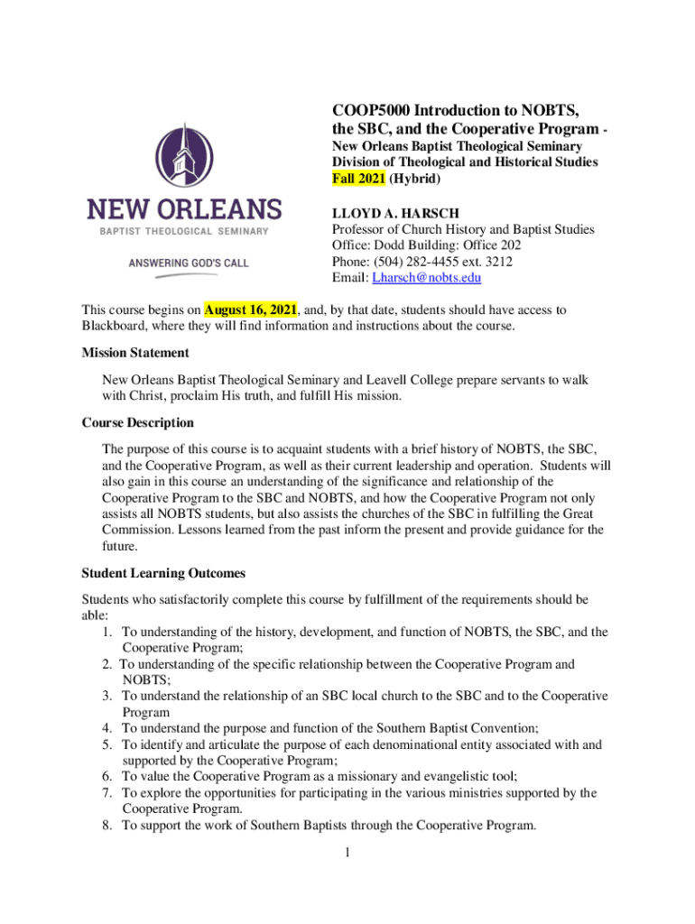 COOP5000 Introduction to NOBS, the SBC, and the Cooperative Program New Orleans Baptist Theological Seminary Division of Theological and Historical Studies Fall 2021 (Hybrid) LLOYD A. HARSH Professor