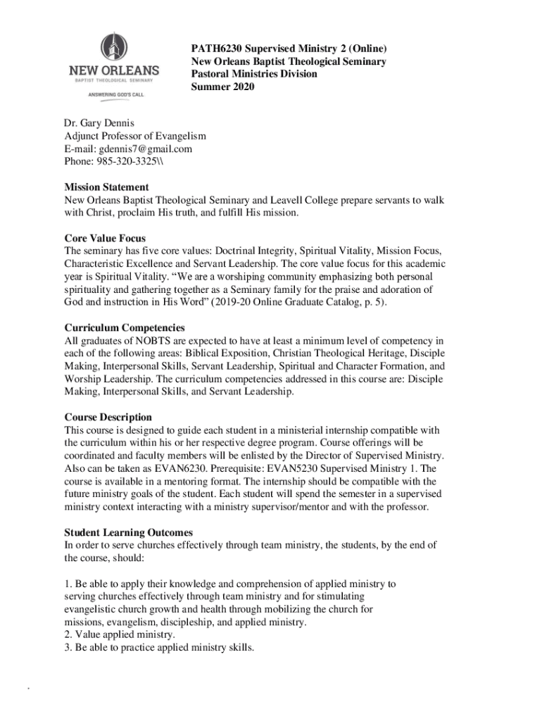 PATH6230 Supervised Ministry 2 (Online) New Orleans Baptist Theological Seminary Pastoral Ministries Division Summer 2020 Dr. Gary Dennis Adjunct Professor of Evangelism Email: gdennis7@gmail.com