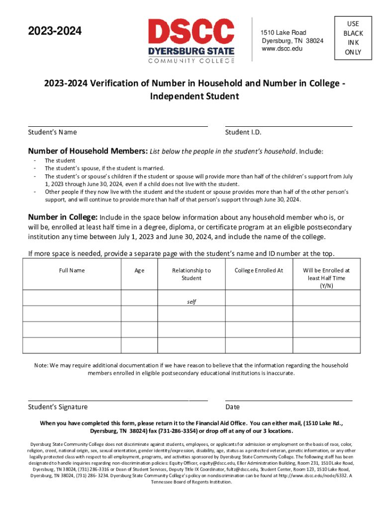 202320241510 Lake Road Dyers burg, TN 38024 www.dscc.eduUSE BLACK INK ONLY20232024 Verification of Number in Household and Number in College Independent Student ___ Students Name___ Student I.D. Number