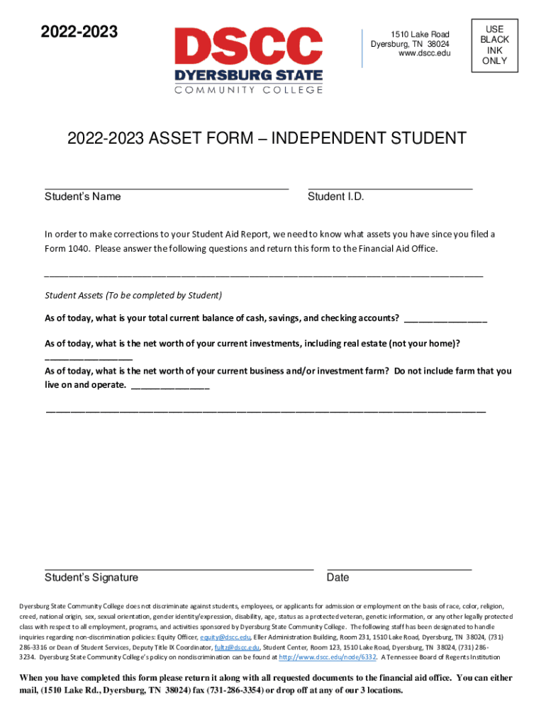 202220231510 Lake Road Dyers burg, TN 38024 www.dscc.eduUSE BLACK INK ONLY20222023 ASSET FORM INDEPENDENT STUDENTStudents NameStudent I.D. In order to make corrections to your Student Aid Report,