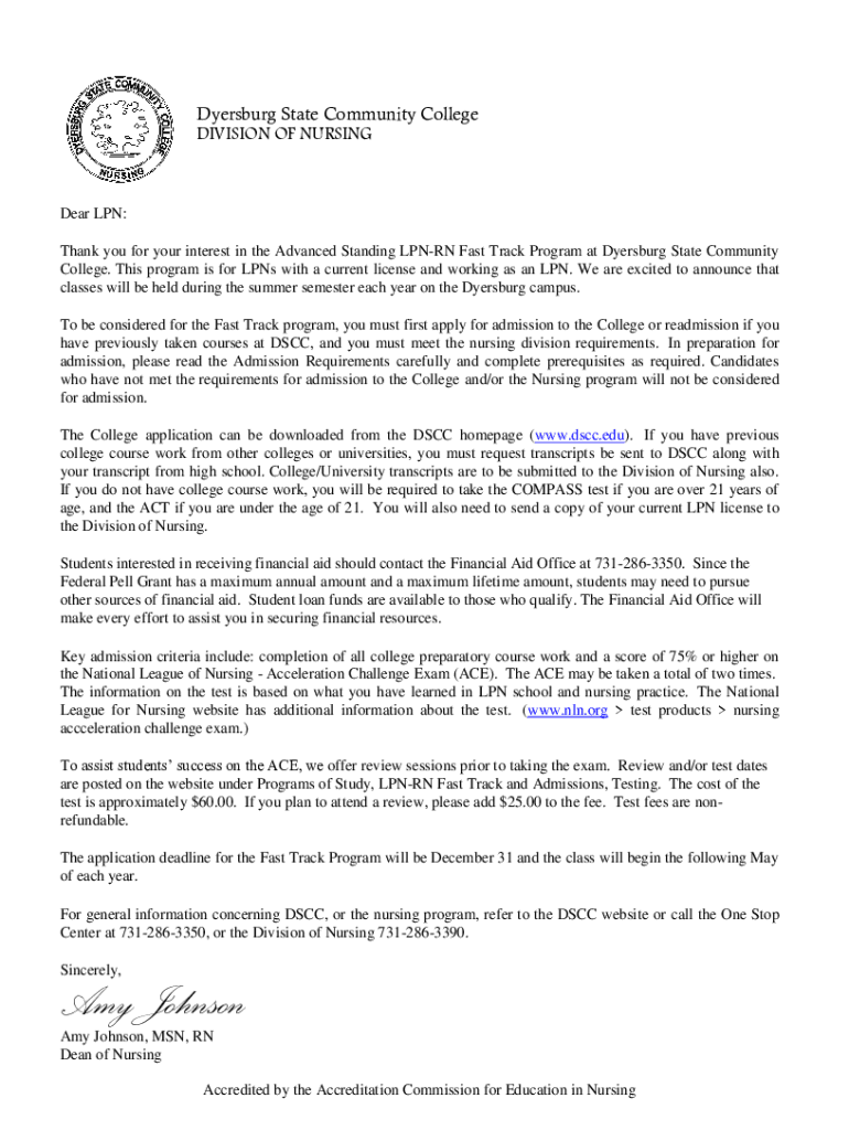 Thank you for your interest in the Advanced Standing LPN RN Fast Track Program at Dyers burg State Community
