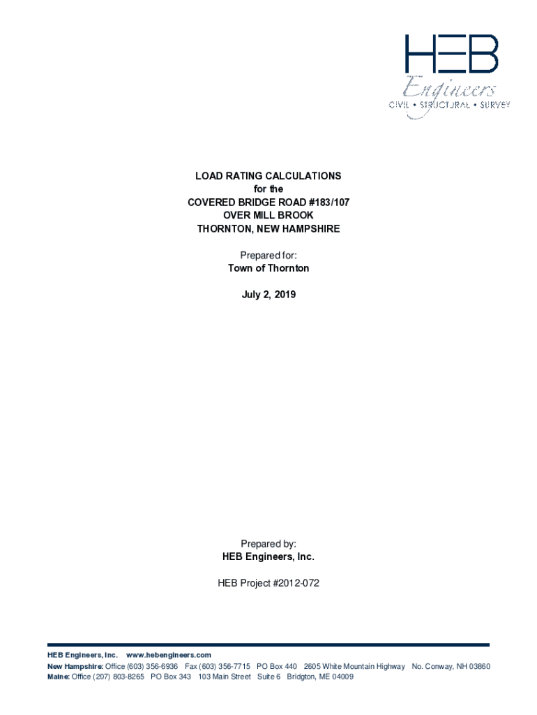 LOAD RATING CALCULATIONS for the COVERED BRIDGE ROAD #183/107 OVER MILL BROOK THORNTON, NEW HAMPSHIRE Prepared for: Town of Thornton July 2, 2019Prepared by: HEB Engineers, Inc. HEB Project #2012072HEB