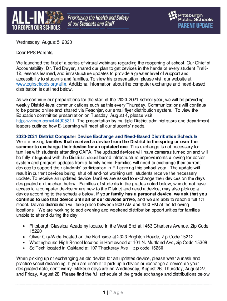 Wednesday, August 5, 2020, Dear PPS Parents, We launched the first of a series of virtual webinars regarding the reopening of school. Our Chief of Accountability, Dr. Ted Dwyer, shared our plan to