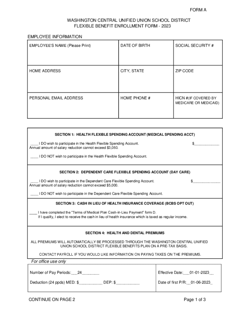 FORM A WASHINGTON CENTRAL UNIFIED UNION SCHOOL DISTRICT FLEXIBLE BENEFIT ENROLLMENT FORM 2023 EMPLOYEE INFORMATION EMPLOYEES NAME (Please Print)DATE OF BIOSOCIAL SECURITY #HOME ADDRESSING, STATE ZIP