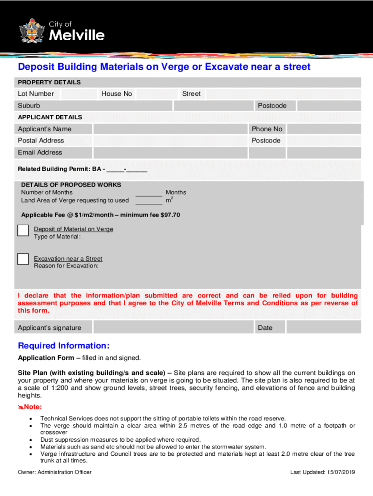 Deposit Building Materials on Verge or Excavate near a street PROPERTY DETAILS Lot Number House NoStreetSuburbPostcodeAPPLICANT DETAILSApplicants Telephone Postal AddressPostcodeEmail Address Related