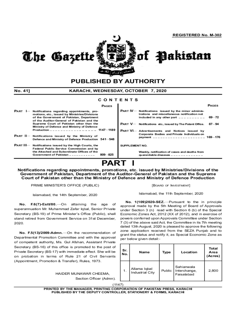 REGISTERED No. M302 ___PUBLISHED BY AUTHORITY No. 41]KARACHI, WEDNESDAY, OCTOBER 7, 2020, C O N T E N T S PASSAGES PART I___Notifications regarding appointments, promotions, etc., issued by Ministries/Divisions