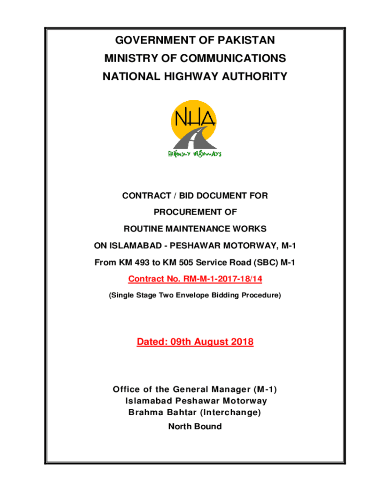 GOVERNMENT OF PAKISTAN MINISTRY OF COMMUNICATIONS NATIONAL HIGHWAY AUTHORITYCONTRACT / BID DOCUMENT FOR PROCUREMENT OF ROUTINE MAINTENANCE WORKS ON ISLAMABAD PESHAWAR FREEWAY, M1 From KM 493 to KM