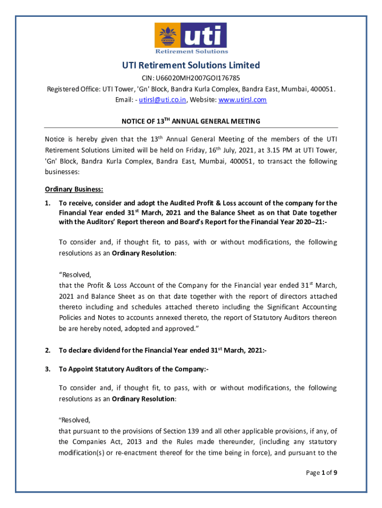 UTI Retirement Solutions Limited IN: U66020MH2007GOI176785 Registered Office: UTI Tower, \'GN\' Block, Sandra Karla Complex, Sandra East, Mumbai, 400051. Email: utirsl@uti.co.in, Website: www.utirsl.com