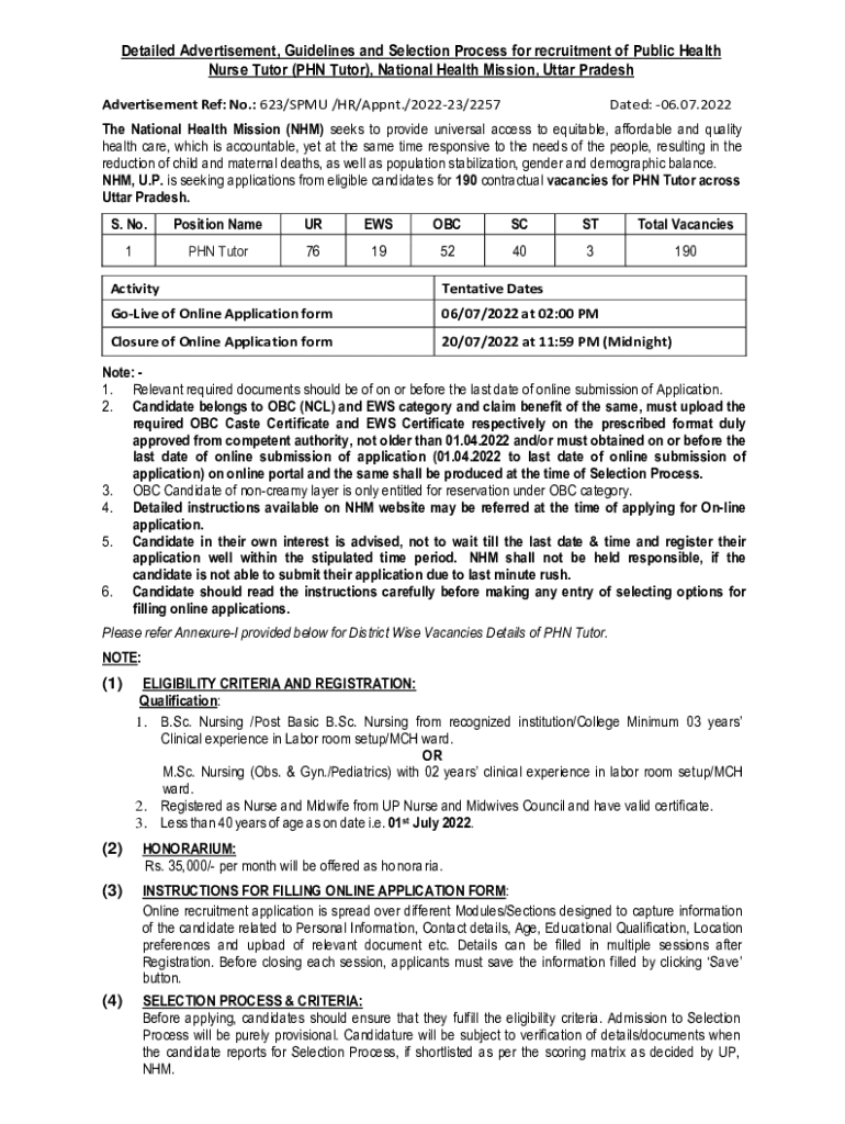 Detailed Advertisement, Guidelines and Selection Process for recruitment of Public Health Nurse Tutor (PhD Tutor), National Health Mission, Uttar Pradesh Advertisement Ref: No.: 623/PMU /HR/Spent./202223/2257Dated: