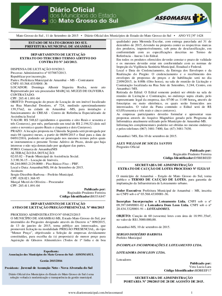Mato Grosso do Sul, 11 de September de 2015 Dario Official dos Municipal do Est ado do Mato Grosso do Sul ANO VI | N 1428