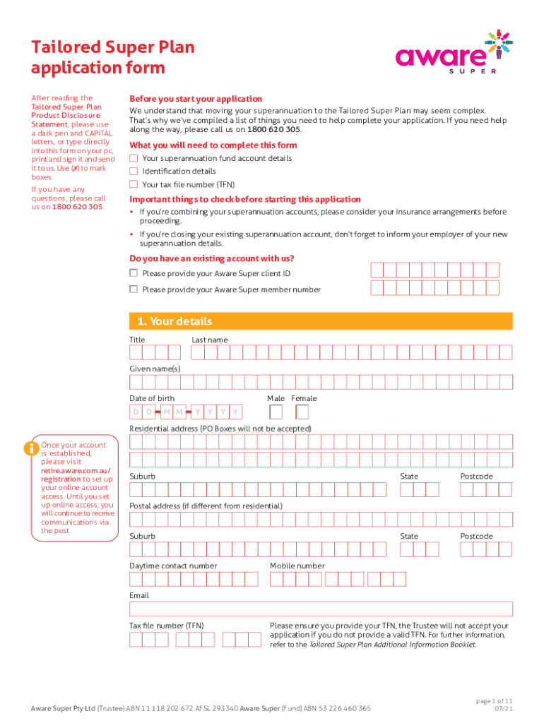 Tailored Super Plan application form After reading the Tailored Super Plan Product Disclosure Statement, please use a dark pen and CAPITAL letters, or type directly into this form on your PC, print