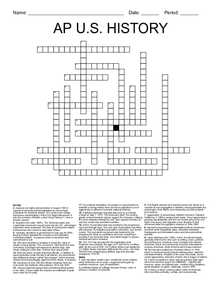 Name: ___ Date: ___ Period: ___AP U.S. HISTORY 1 2 34 5 67891011121314151617181920Across 2. Massive civil rights demonstration in August 1963 in support of Kennedy backed legislation to secure legal