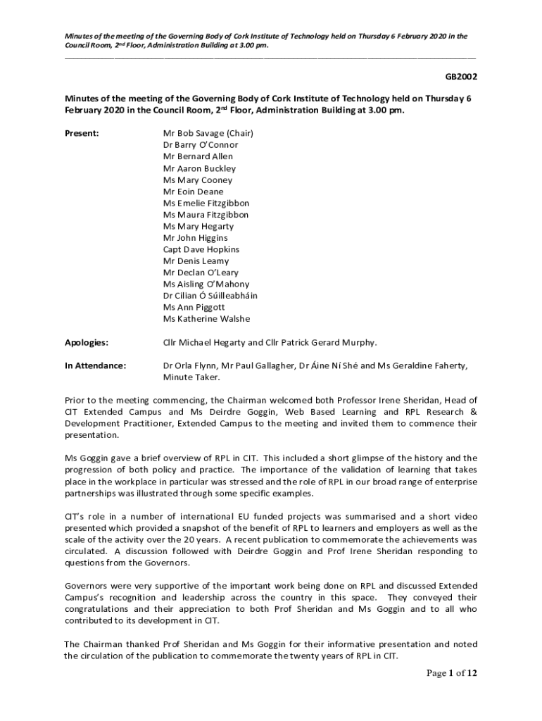 Minutes of the meeting of the Governing Body of Cork Institute of Technology held on Thursday 6 February 2020 in the Council Room, 2nd Floor, Administration Building at 3.00 pm. ___GB2002 Minutes